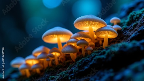 Glowing Mushrooms On A Mossy Log