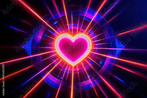 Glowing neon heart with radiant rays illuminating abstract love and romance