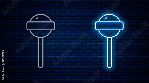 Glowing neon line Lollipop icon isolated on brick wall background. Food, delicious symbol. Vector.