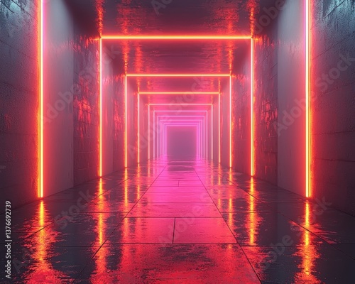 Glowing neon pink and red lines illuminate a reflective, metallic corridor, creating a futuristic and vibrant atmosphere