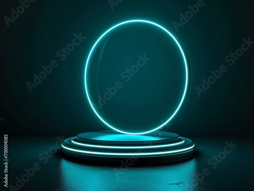 Glowing neon round podium on a dark background. 3d rendering Generative AI