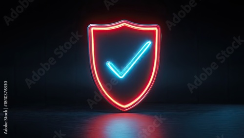 Glowing neon shield with a bright blue checkmark on a reflective dark surface