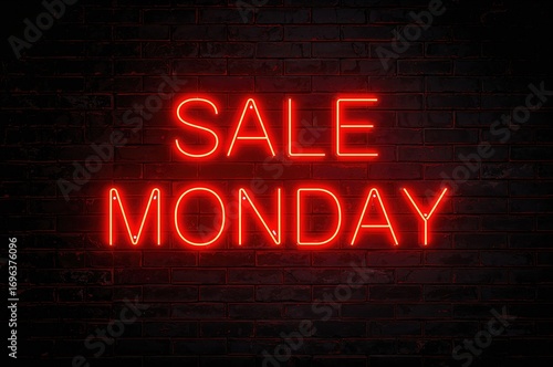 Glowing neon signage against dark brick backdrop. Space for text. Top view. Discount theme