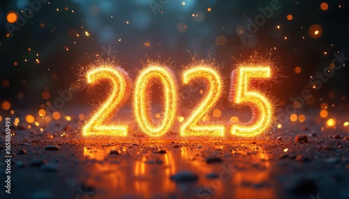 Glowing numbers 2025 illuminate night sky with bright fireworks, gold, orange, blue colors. Festive celebration sparkles with bokeh, confetti. New Year Eve future, magic, joy, excitement.