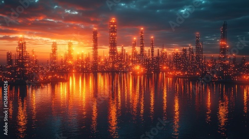 Glowing Oil Refinery Skyline at Sunset with Vibrant Reflections on Water Surface