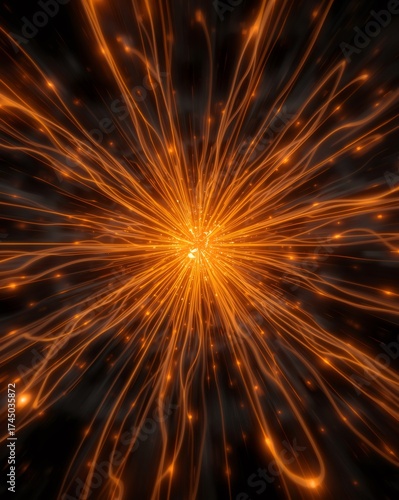 Glowing orange energy radiating light particles abstract background