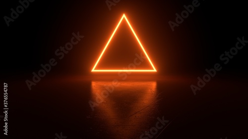 Glowing orange triangle in the dark. Geometric abstract figure in neon light on black background. Laser glow. Fashion concept, laser show. 3d rendering