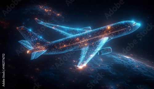 Glowing plane flies over celestial spheres
