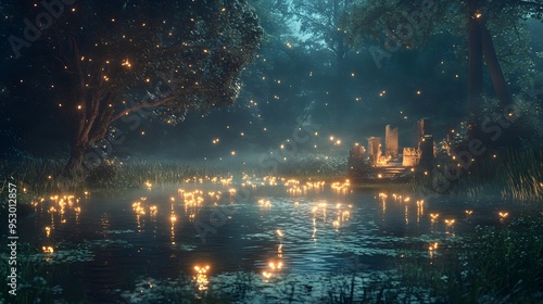 Glowing pond in a magical forest clearing with fireflies and ancient ruins at twilight Fairy tale-inspired with glowing elements soft mystical lighting and 3D-rendered enchanted flora