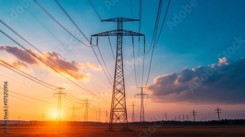 Glowing Power Grid at Dramatic Sunrise or Sunset with Cloudy Sky