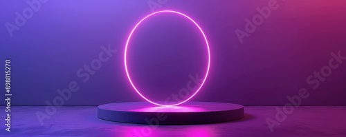 Glowing purple circle on stage with vibrant neon lights in a futuristic setting