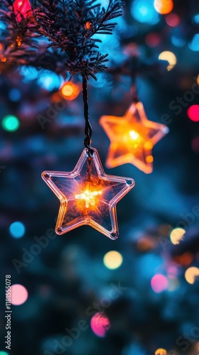 Glowing Star Christmas Lights on a Pine Tree with Bokeh Background.