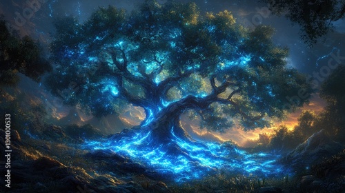 Glowing Tree in Mystical Forest at Dusk