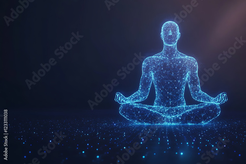 Glowing wireframe of a person in a meditative pose, representing tranquility and inner peace