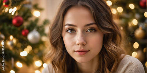 Glückliche hübsche junge frau mit weihnachtlichem hintergrund