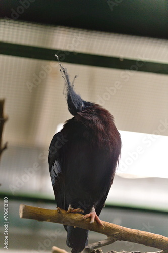 Gołąb koroniec plamoczuby (Victoria crowned pidgeon) siedzący na grzędzie w ptaszarni, czyszczący swoje pióra