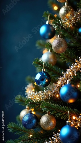 Gold and blue Christmas tree with intricate silver garlands, festive, luxurious