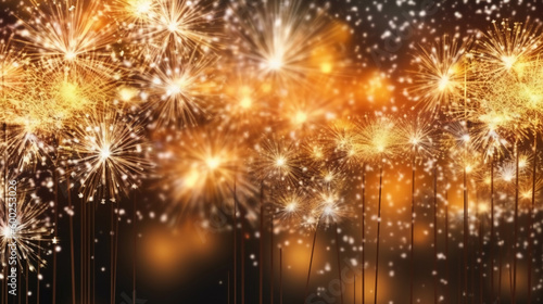 Gold and silver Fireworks and bokeh in New Year eve and copy space. Abstract background holiday. AI generative
