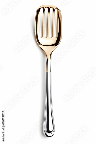 Gold and silver serving spoon; isolated, white background; elegant kitchen utensil
