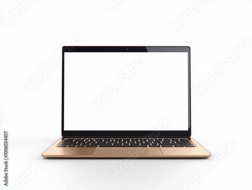 Gold laptop blank screen modern minimalist workspace technology business mockup isolated white background digital device computer portable stylish sleek flatlay front view advertisement