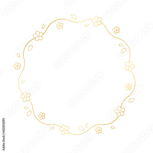 Gold Round Floral Frame Outline Doodle. Spring botanical circle border template, flourish design element for wedding, greeting card.