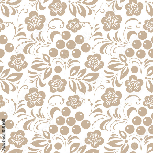 Gold russian old style ornament Hohloma seamless pattern. Vector Floral slavic traditional decoration motive. For cards, fabric, textiles, clothing, packaging.