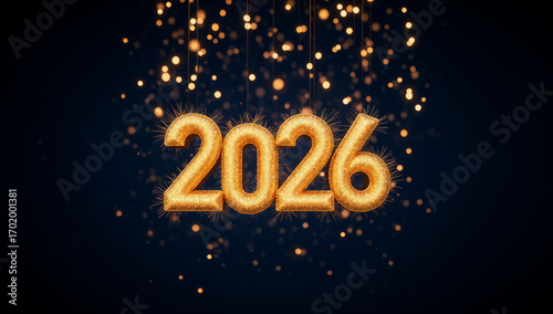 Golden 2026 Balloons against a Dark Background. Glittering, illuminated numbers hang suspended in the center, surrounded by a cascade of small, golden sparkles. The numbers have a textured, glittery