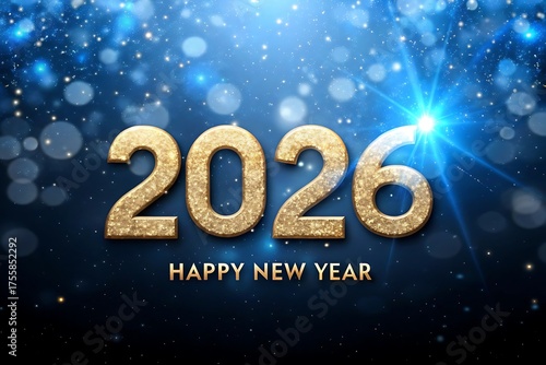 Golden 2026 happy new year text with sparkling bokeh lights and festive blue background