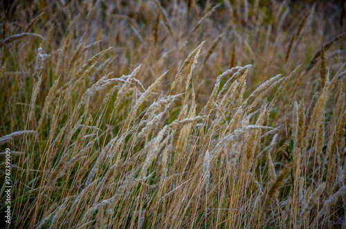 Golden Autumn Field Texture Close-up of Dry Wild Grass Stalks