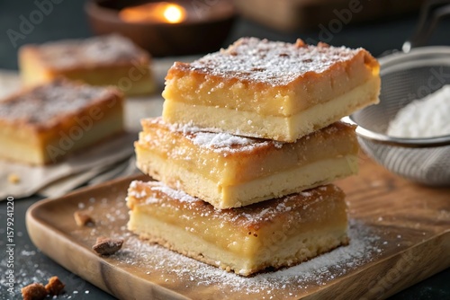 Golden baked dessert bars dusted with powdered sugar image