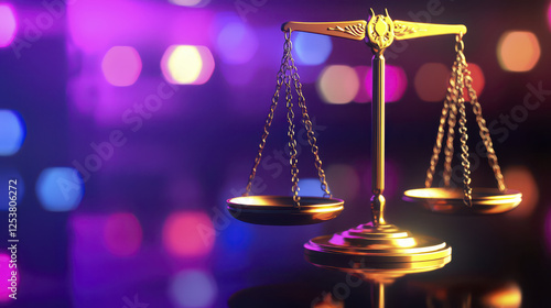 golden balance scale symbolizes justice and fairness, set against colorful bokeh background