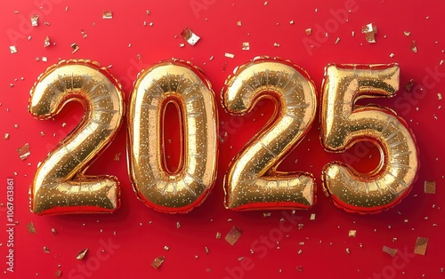 Golden balloons depicting the year 2025 stand out against a vibrant red backdrop. Surrounding the numbers are scattered confetti and decorative ornaments, enhancing the festive mood.