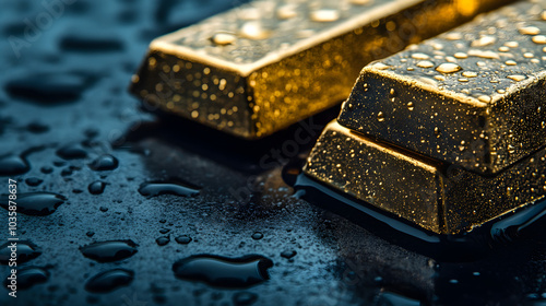 Golden bars resting on a wet surface with drops of water reflecting subtle light