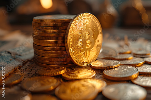 Golden Bitcoin Stack: Cryptocurrency Wealth and Investment,Bitcoin coins on wooden table, closeup. Cryptocurrency concept