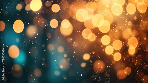 Golden bokeh lights reflecting sparkling glitter particles creating abstract celebration background