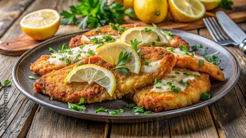 Golden brown breaded chicken fillets topped with melted Parmesan cheese, garnished with fresh lemon slices on a rustic plate.