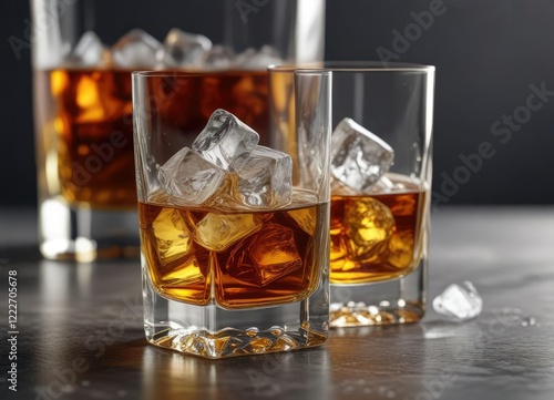 Golden brown whiskey with ice cubes in a glass, luxury drink, refreshment cocktail, boozy