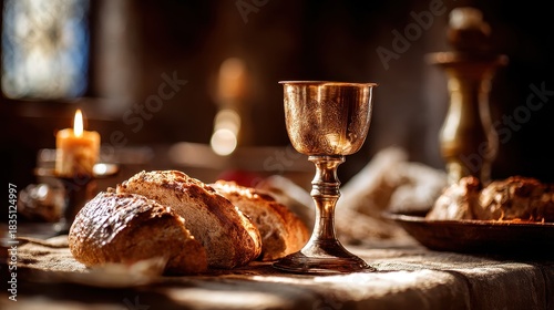 Golden Chalice and Bread on a Table Illuminated by Candlelight in a Dark Interior