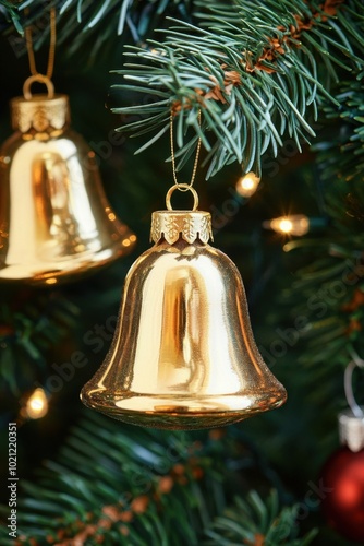 Golden Christmas bells hanging on a fir tree with festive decorations
