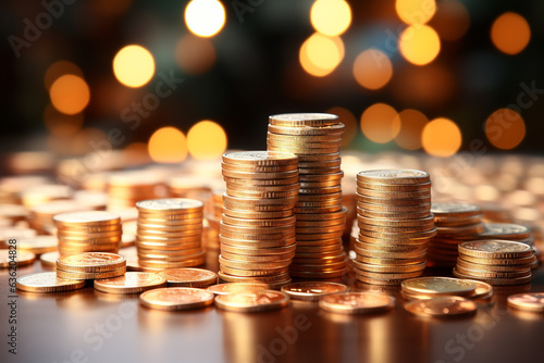 Golden coins stacks on bright light glowing bokeh background, business finance wealth and success concept
