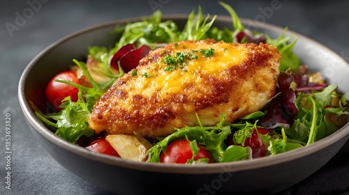 Golden crispy chicken fillet with melted cheese served on a fresh salad bowl