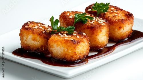 Golden Crispy Nuggets Served on a White Rectangular Plate with Garnishes