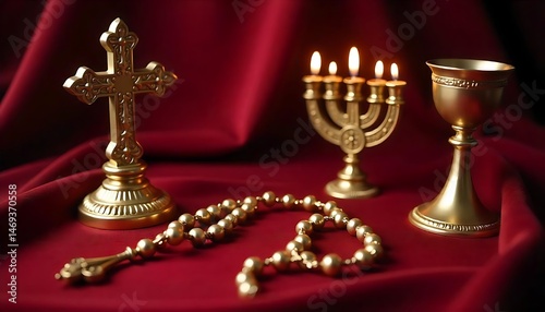 Golden Cross, Menorah, Chalice and Rosary Beads on Red Fabric Background Religious Symbols Faith Spirituality