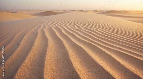 Golden desert landscape featuring rolling sand dunes under a warm, serene, pastel sunset sky.