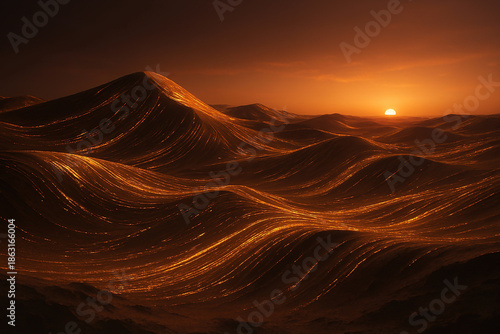 Golden Digital Wave Landscape at Sunset with Flowing Light Lines Showing Futuristic Energy and Data Terrain Concept