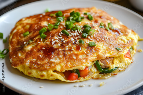 Golden Egg Foo Young with savory vegetables and tender meat, drizzled with sweet and sour sauce on white plate