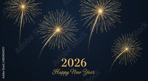 Golden fireworks illuminate a dark night sky celebrating the arrival of the new year 2026 with elegant typography wishes