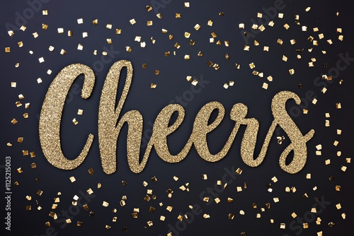 Golden Glitter Cheers Sign with Confetti on Dark Background for Celebration.