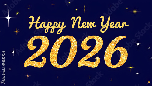 Golden Happy New Year 2026 text with glitter and stars image