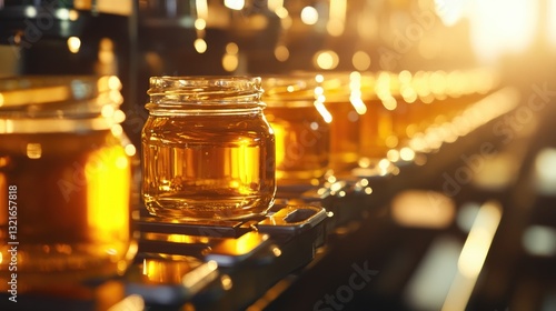 Golden Honey Jars on Conveyor Belt: Sweet Production Line